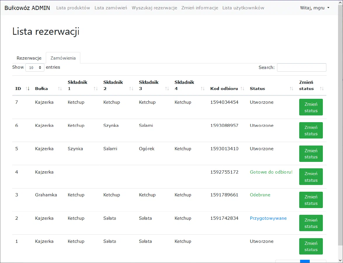 - Możliwość ułożenia własnej bułki z predefiniowanych składników oraz obliczanie ceny